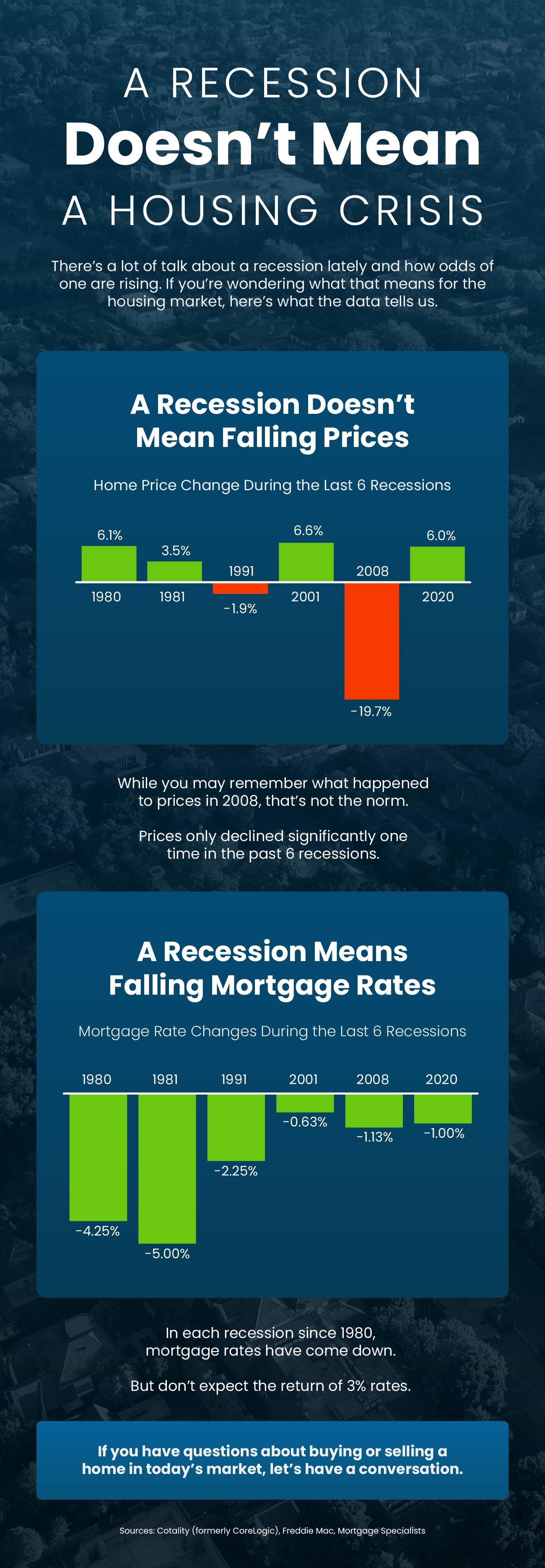 - There’s a lot of talk about a recession lately and how the odds of one are rising. If you’re wondering what that means for the housing market, here’s what the data tells us.